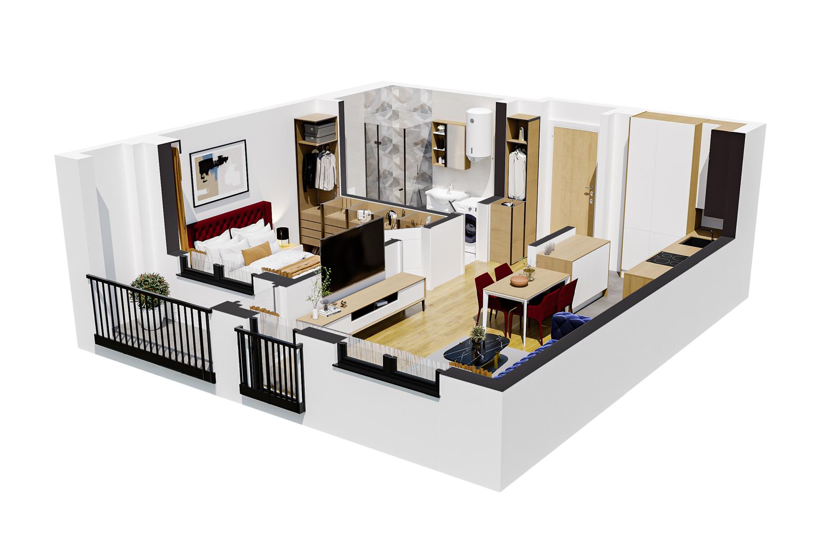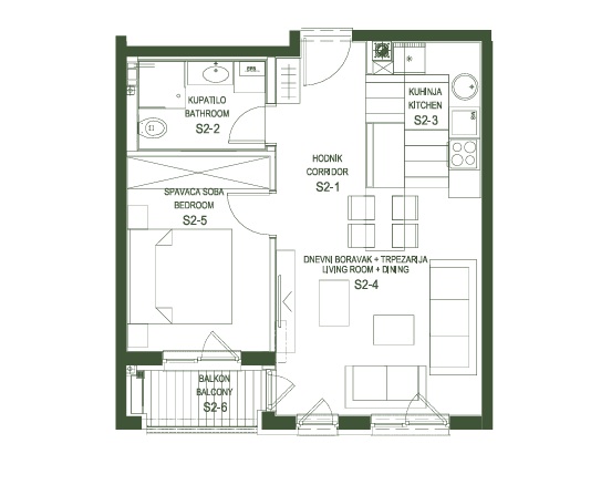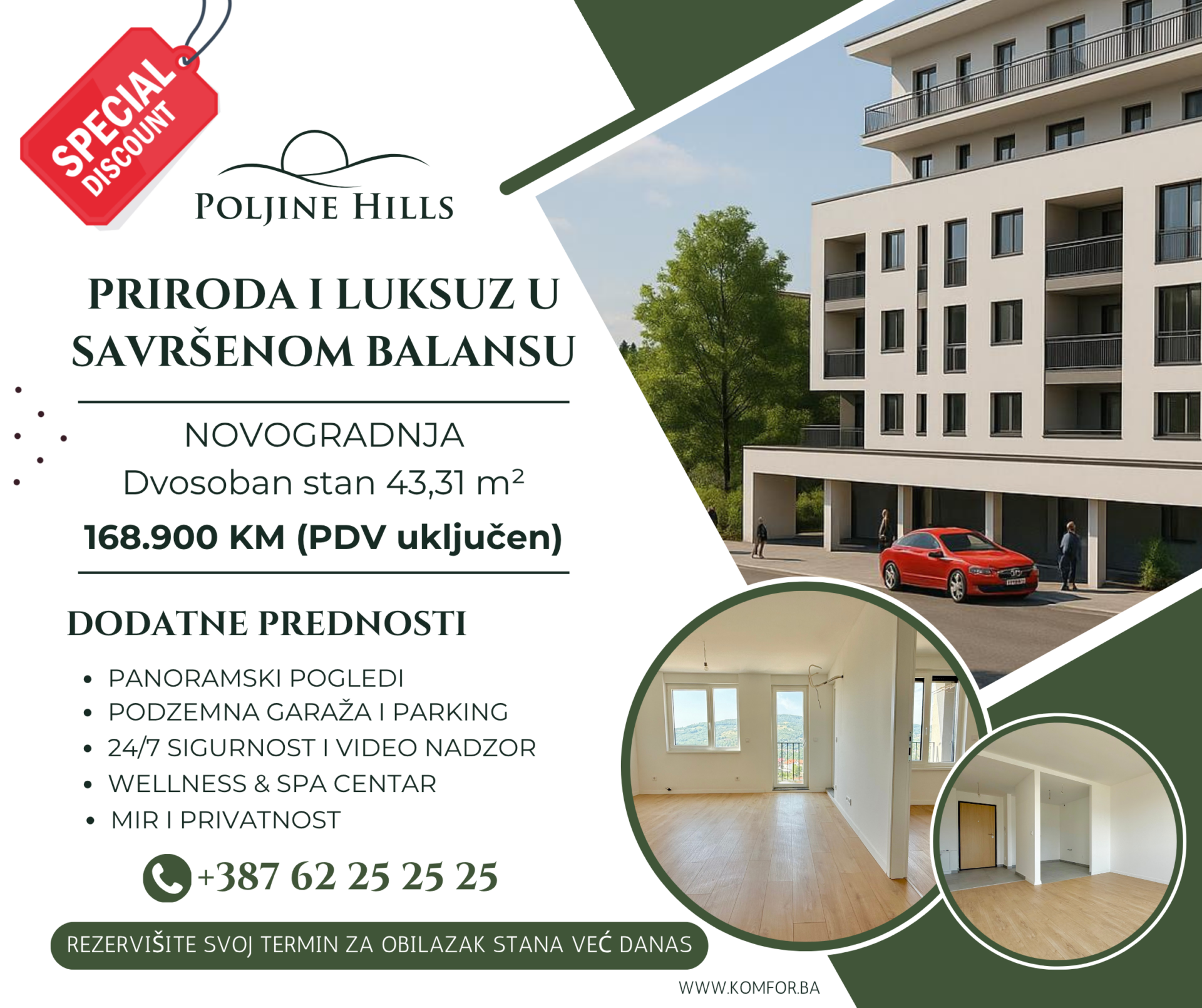 Na prodaju je luksuzni dvosoban stan površine 43,31 m², smješten na drugom spratu moderne stambene zgrade u najprestižnijem rezidencijalnom kompleksu u Sarajevu – Poljine Hills.